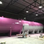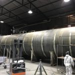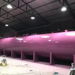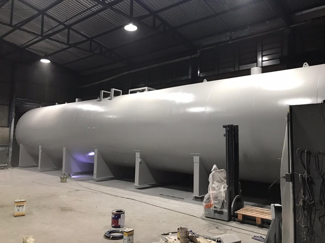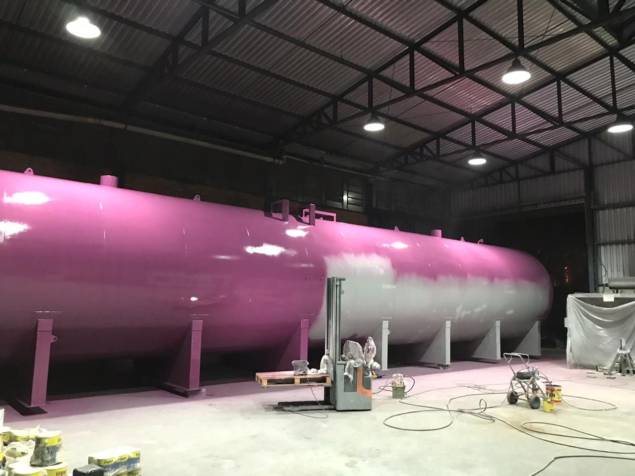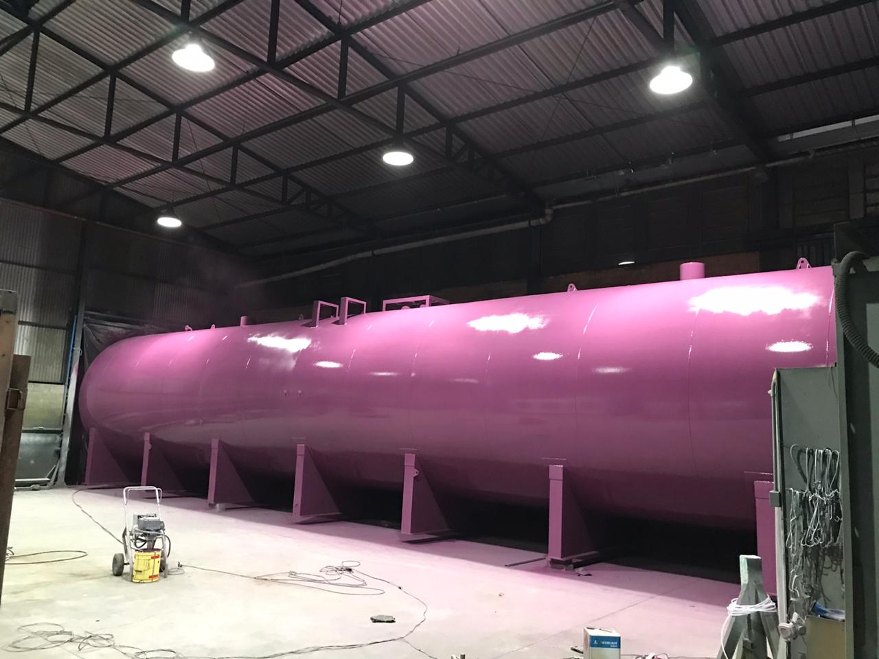 Jateamento padrão SA2 1/2, aplicação de primer e acabamento em tanque de 21 metros de comprimento.